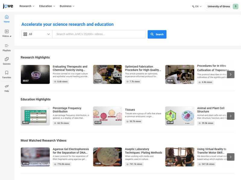 Ara, JoVE s’amplia amb una nova col·lecció: JoVE Business, que inclou continguts audiovisuals de gran qualitat en les àrees de economia, màrqueting, comptabilitat i finances. Aquest bloc està en constant creixement i es preveu que a finals d’any compti amb més de 1.500 vídeos. Aquesta col·lecció se suma a les de JoVE Research i JoVE Education, ja disponibles, i que ofereixen recursos visuals per a la recerca i educació científica. Els vídeos de JoVE Business estan dissenyats per facilitar la comprensió de conceptes clau mitjançant exemples pràctics, escenaris reals i animacions didàctiques. Són una eina excel·lent tant per a estudiants com per a professorat, ja que permeten enriquir les classes amb recursos visuals innovadors i actualitzats. Hi podeu accedir a través del cercador d'informació científica: Omnia - Base de dades JoVE