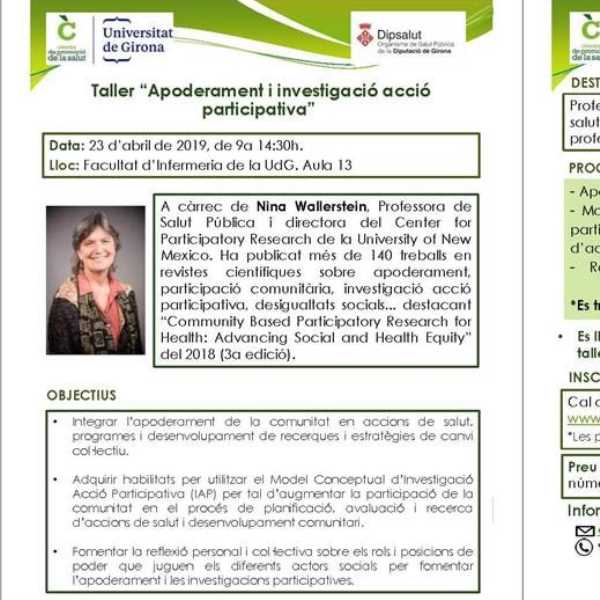 El 23 d’abril se celebrarà el Taller “Apoderament i investigació acció participativa” a la Facultat d’Infermeria de la UdG, i que impartirà la Dra. Nina Wallerstein. L’esdeveniment organitzat per la Càtedra Promoció de la Salut de la Universitat de Girona i Dipsalut té com a objectius integrar l’apoderament en accions de salut, programes i desenvolupaments de recerques i estratègies de canvi col·lectiu. Adquirir habilitats per utilitzar el Model Conceptual (IAP) per tal d’augmentar la participació de la comunitat en el procés de planificació, avaluació i recerca d’accions de salut i desenvolupament comunitari. Fomentar la reflexió personal i col·lectiva sobre els rols i posicions de poder que juguen els diferents actors socials per fomentar l’apoderament i les investigacions participatives. Inscripcions: https://www.udg.edu/ca/catedres/Promocio-salut/Inscripcio-a-una-activitat