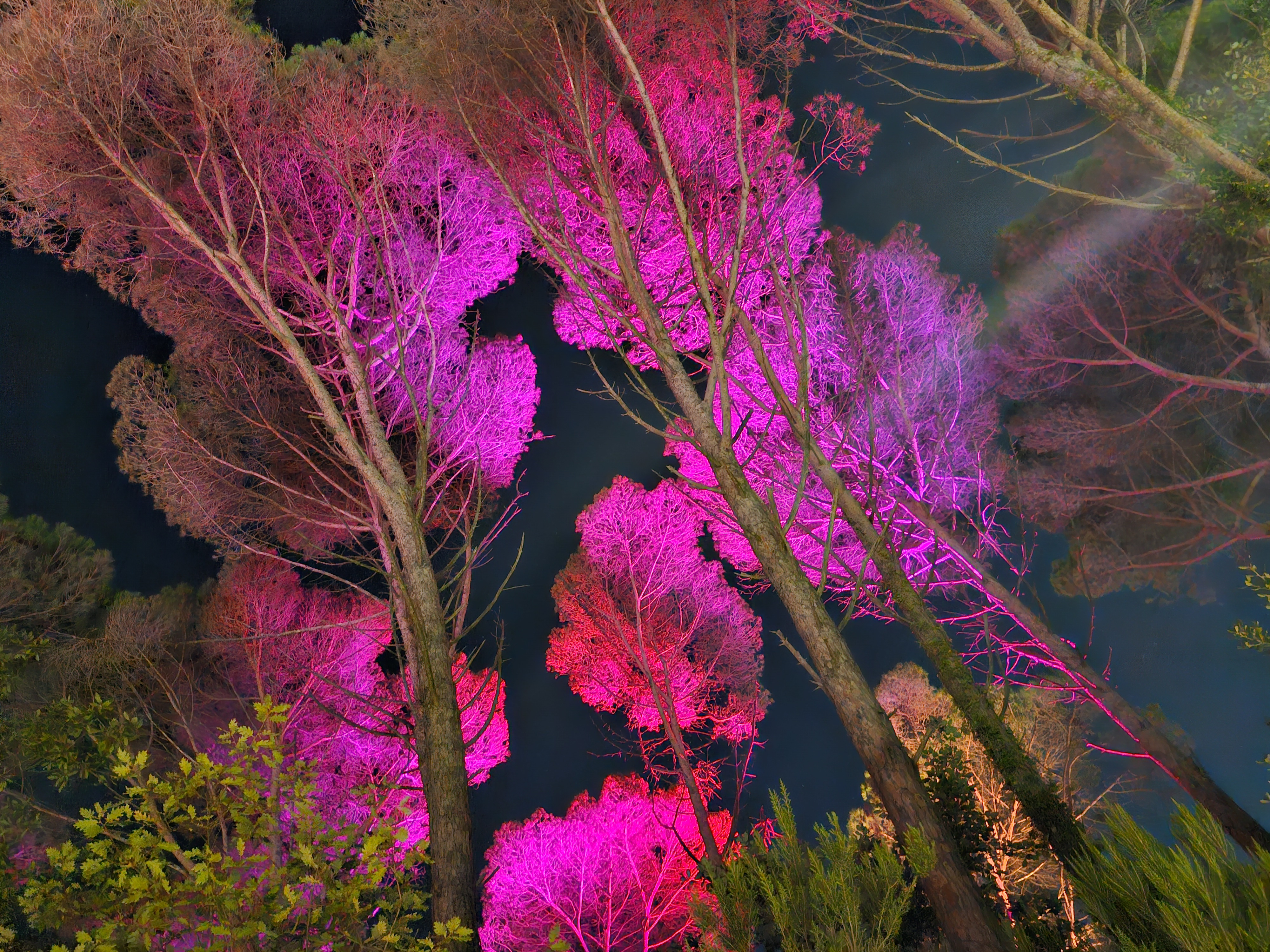 Els sons de la nit s’uneixen al paisatge visual; cada fulla que cau, cada grinyol del vent i cada moviment d’algun animal nocturn aporten un ritme que accentua la bellesa del bosc il·luminat. Aquesta harmonia inesperada entre la foscor, la llum i la tranquil·litat crea una simfonia eclèctica que converteix el bosc en una obra d'art efímera.