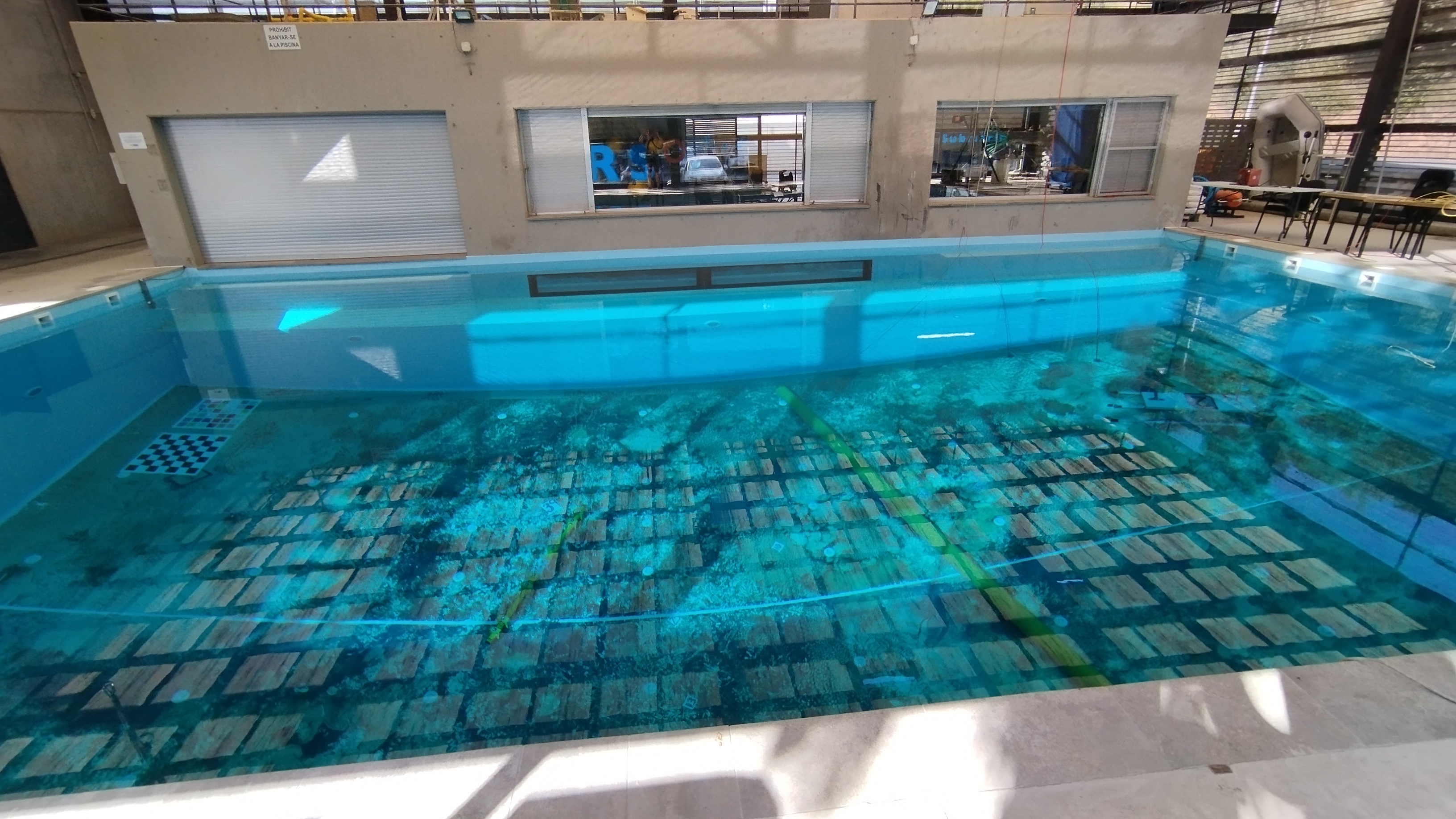 Sala a nivell submergit amb finestra de 5.6m x 1.2m per visió directa a l’interior del tanc Pont grua de fins a 2T amb 1 eix lineal sobre el tanc Sistema de 4 càmeres per enregistrament d’imatges submarines Sistema d’ancoratges cada 1m al voltant del tanc