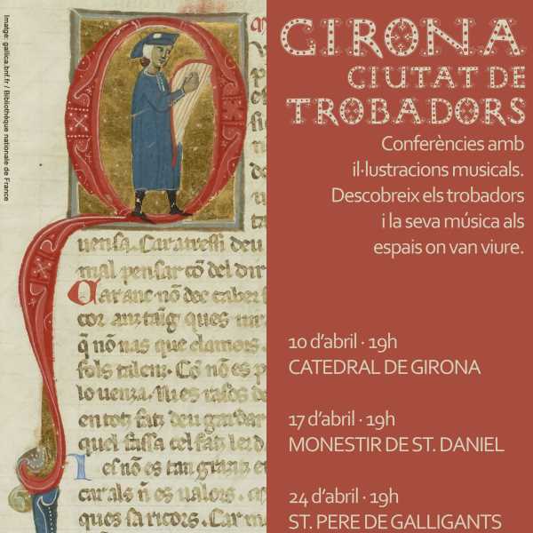 Els pròxims dies 10, 17 i 24 d'abril de 2024, a les 19.00 h, se celebrarà el cicle de conferències Girona, ciutat de trobadors amb il·lustracions musicals a la Catedral de Girona, al Monestir de Sant Daniel i a Sant Pere de Galligants. Aquesta activitat està organitzada per la Catedral de Girona, el Monestir de Sant Daniel de Girona, el Museu d'Arqueologia de Catalunya i l'Institut de Llengua i Cultura Catalanes de la Universitat de Girona.
