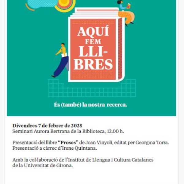 El proper 7 de febrer de 2025 tindrà lloc la presentació del llibre “Proses” de Joan Vinyoli, editat per Georgina Torra. Presentació a càrrec d’Irene Quintana. Amb la col·laboració de l’Institut de Llengua i Cultura Catalanes de la Universitat de Girona. Ben cordialment, Àngel Quintana Degà de la Facultat de Lletres