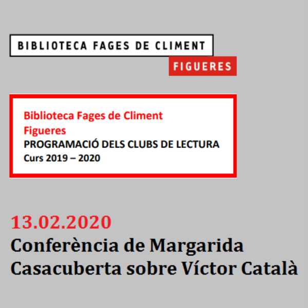 El proper dijous 13 de febrer, Margarida Casacuberta, directora de la Càtedra Víctor Català d'estudis sobre el Modernisme, realitzarà una conferència sobre Víctor Català a la Biblioteca Carles Fages de Climent de Figueres. La iniciativa s'emmarca en les lectures dels diversos clubs de lectura de la mateixa biblioteca. La conferència se centrarà en l'obra literària de l'autora i en l'obra d'art total que Caterina Albert construeix al llarg de la seva vida: la personalitat de Víctor Català. Casacuberta, especialista en narrativa catalana del segle XX, ha publicat recentment l'assaig Víctor Català, l’escriptora emmascarada (L'Avenç: 2019).