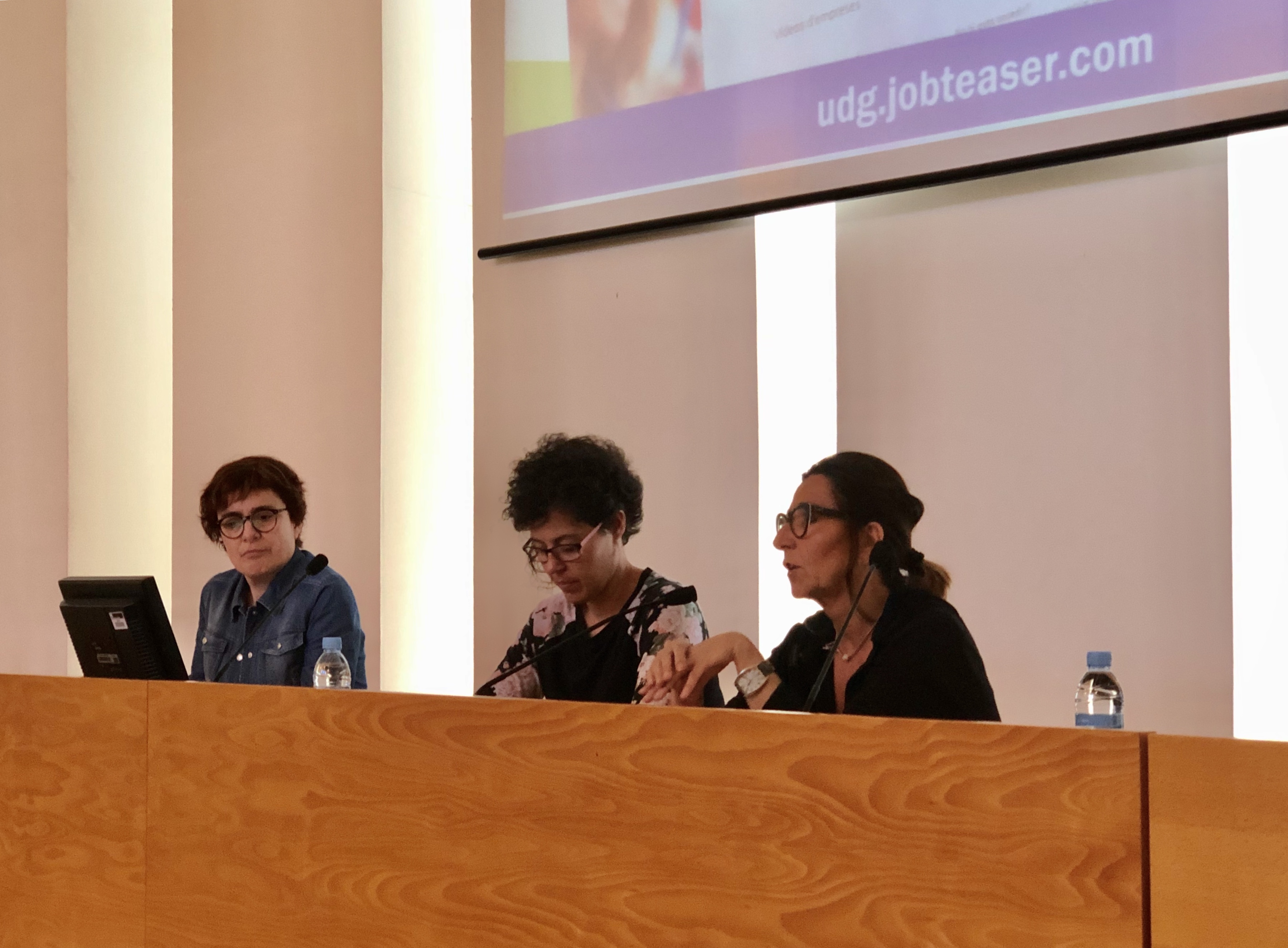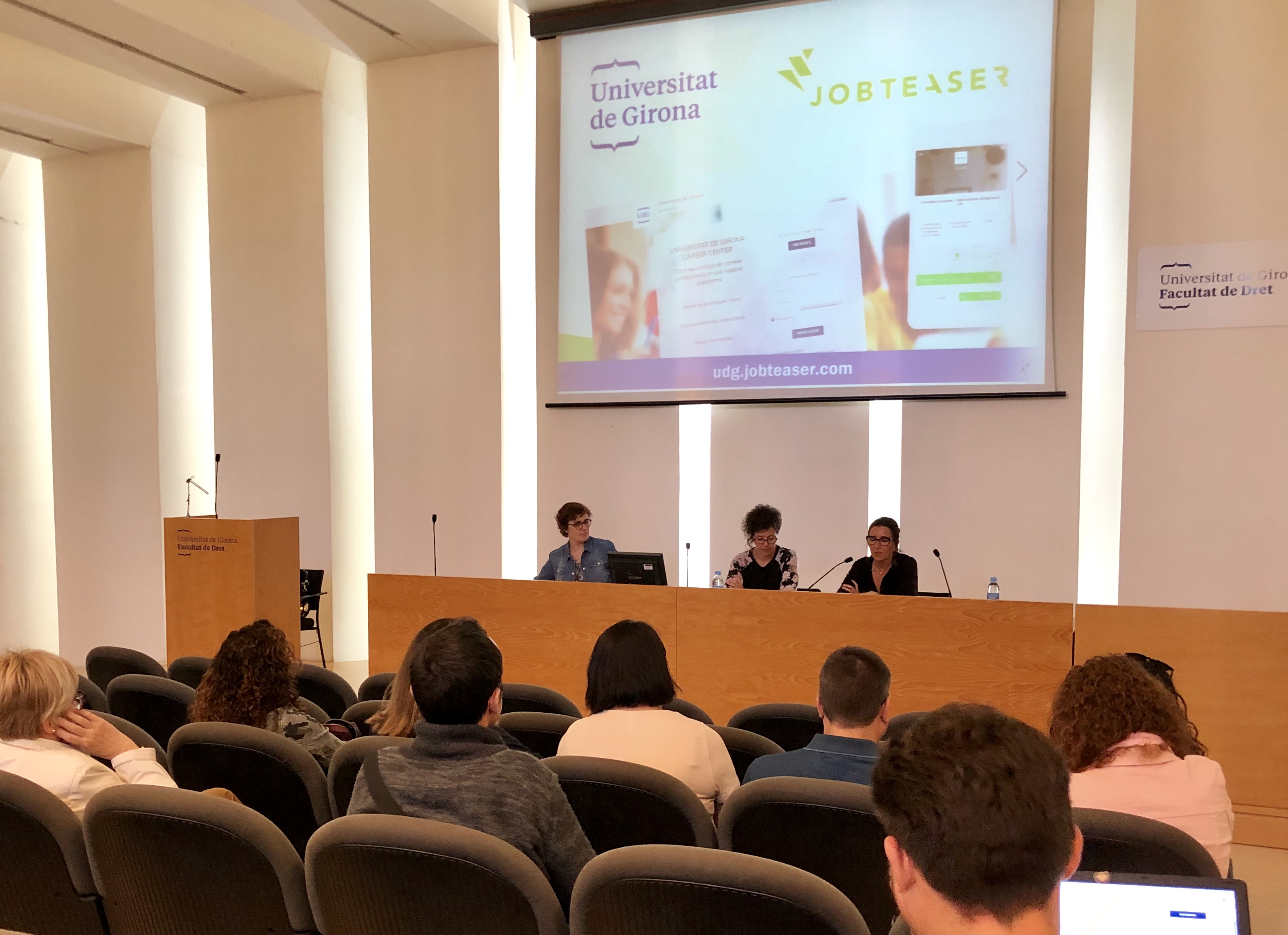 El dimecres 15 de maig, a la Sala de Graus de la Facultat de Dret, es va presentar la nova plataforma de gestió d’ofertes de feina que ha estrenat recentment la Universitat de Girona. L’acte va comptar amb la presència de la Dra. Laura Vall-llosera, vicerectora d’estudiants i inserció laboral, la Sra. Anna Albar, responsable de l’Oficina Universitat-Empresa, i la Sra. Nuri Sanllehí, orientadora professional de la Universitat de Girona.