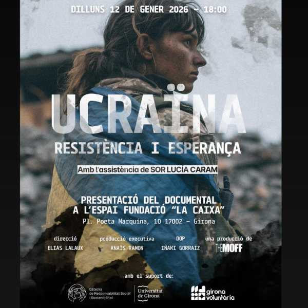 Girona Voluntària i la Càtedra de Responsabilitat Social i Sostenibilitat de la UdG hem organitzat un acte a l’espai Fundació“la Caixa”, plaça Poeta Marquina, 10- 17002 de Girona el proper 12 de gener de 2026 a les 18 hores. Es presentarà el documental:“UCRAÏNA RESISTÈNCIA I ESPERANÇA”Amb l’assistència de SOR LUCIA CARAMDirecció documental: Elias Lalaux. Producció executiva: Anaïs Ramon. DOP: Iñaki Gorratz. Producció: THEMOFF.En acabar la projecció el periodista JORDI GRAU entrevistarà SOR LUCIA CARAM.Per assistir cal inscripció prèvia al següent enllaç:https://forms.gle/AU21QZHdNFnANPTp9Com que l’espai és limitat, s’atendran les peticions per rigorós ordre d’inscripció.