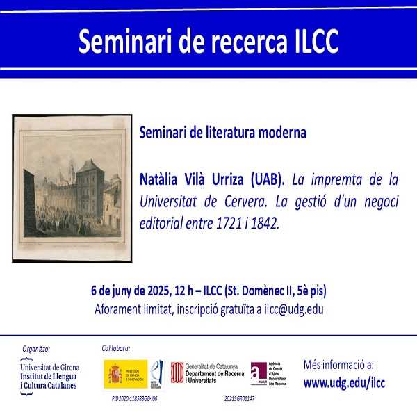 Seminari de literatura moderna Natàlia Vilà Urriza (Universitat Autònoma de Barcelona). La impremta de la Universitat de Cervera. La gestió d'un negoci editorial entre 1721 i 1842. Dia: 06.06.2025Hora: 12:00 hLloc: sala de l'ILCC (St. Domènec II, 5è pis)Inscripcions: aforament limitat, inscripció gratuïta a ilcc@udg.edu.