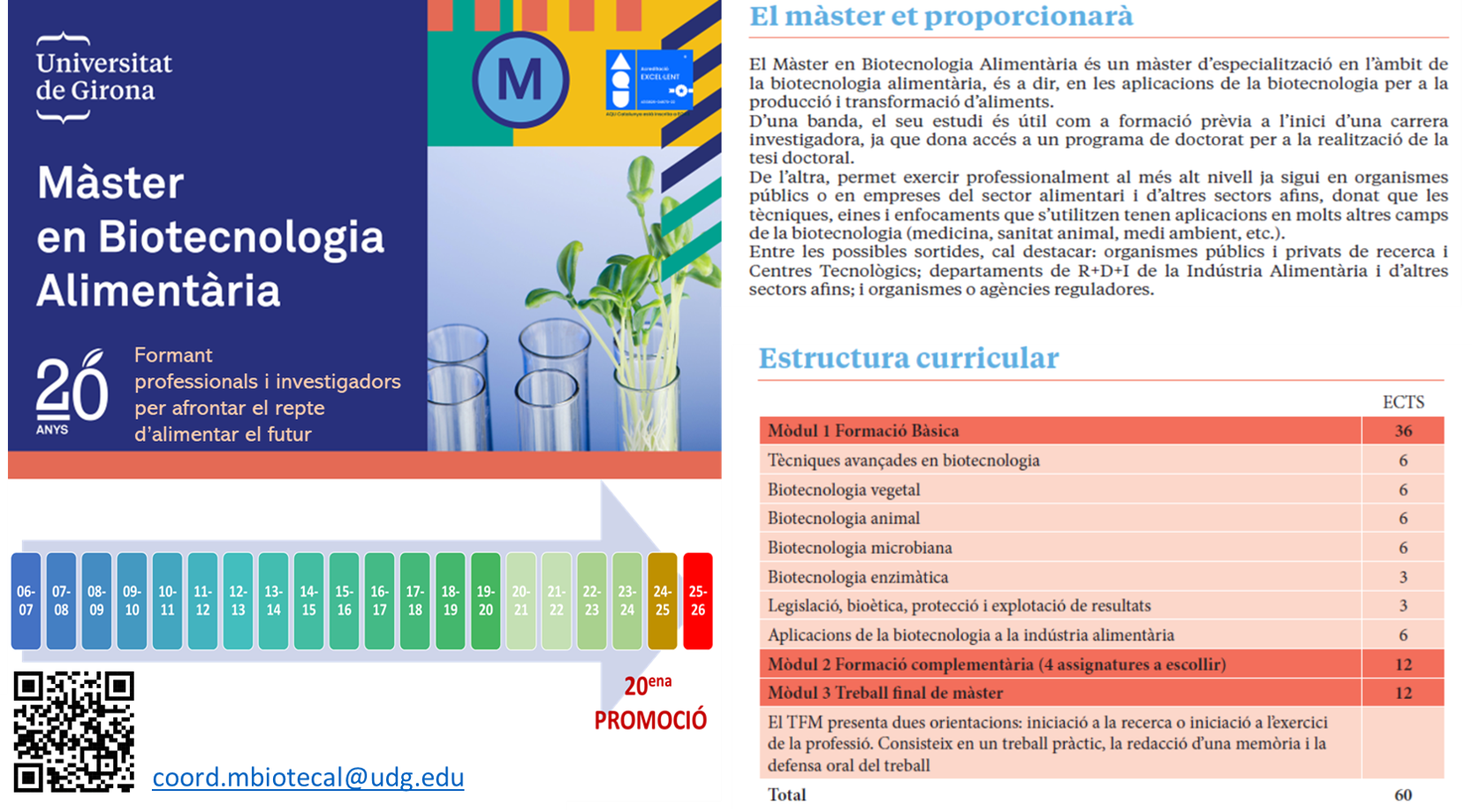 The support received by the Master in Food Biotechnology from the Food and Gastronomy Campus at the University of Girona makes it a benchmark master's degree in the sector.A research, teaching and services provision hub in food and gastronomy technologies, the Campus comprises a node that connects the specialist ecosystem in the territory and within the main national, state and international networks.