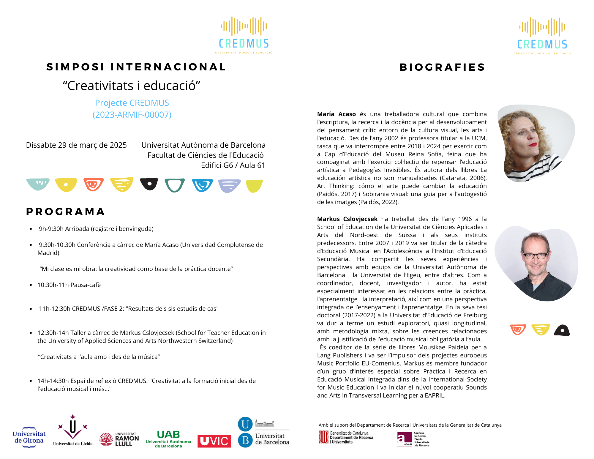 El passat 29 de març de 2025 va tenir lloc el simposi internacional del projecte CREDMUS a la Universitat Autònoma de Barcelona, centrat en el foment de la creativitat en la formació inicial docent. La jornada va començar amb una conferència inaugural a càrrec de María Acaso, qui va plantejar l'activitat docent com una pràctica artística y creativa, capaç de transformar l’educació. Tot seguit, es van presentar els resultats dels sis estudis de cas desenvolupats en el marc del projecte CREDMUS, els quals analitzaven experiències creatives observades en sis centres de Primària. També es va oferir un taller pràctic guiat per Markus Cslovjecsek, que va permetre explorar estratègies per estimular la creativitat musical en contextos educatius interdisciplinaris diversos. El simposi va reforçar la rellevància del projecte CREDMUS com a espai de recerca educativa y col·laboració per a la innovació entre universitat escola, promovent una mirada transversal i pràctica per enriquir la formació dels futurs mestres.Programa
