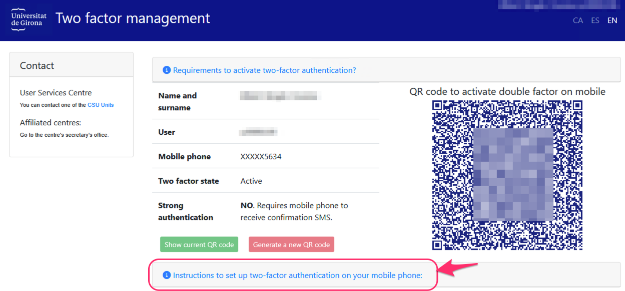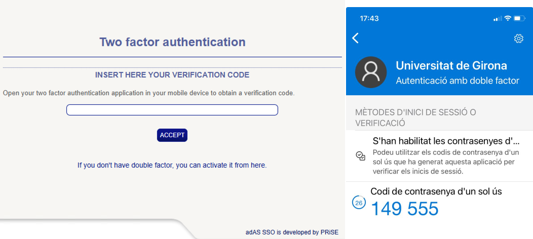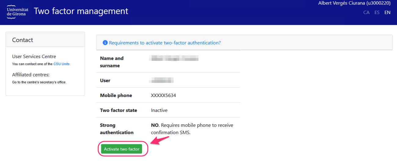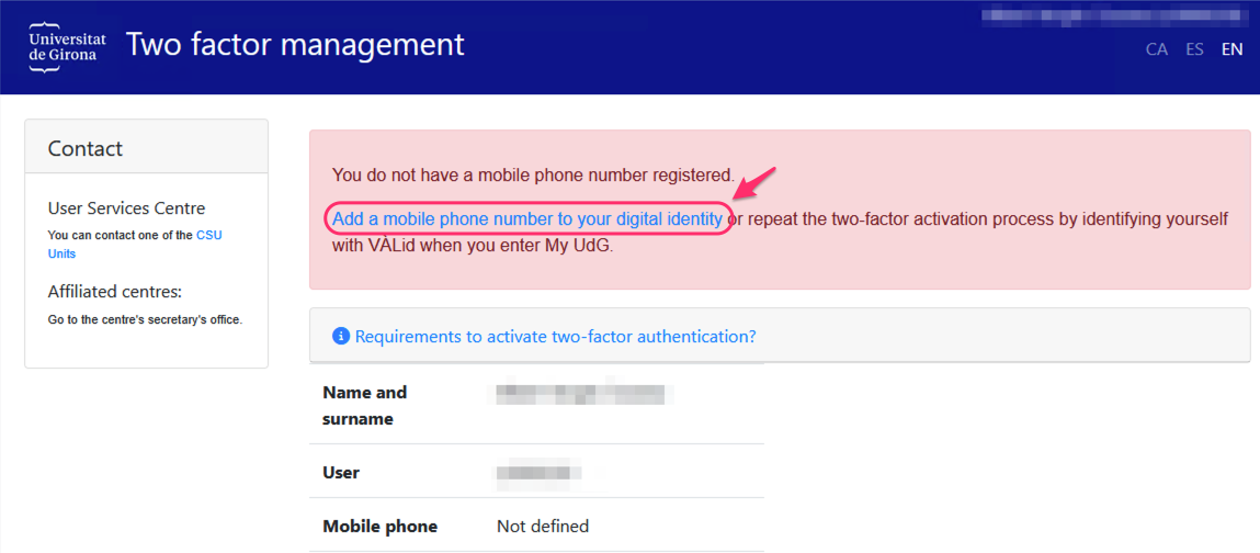This link will take you to the screen to enter your mobile phone number, and you will also have to allow the UdG to send you SMS messages for the sole purpose of verifying your identity.