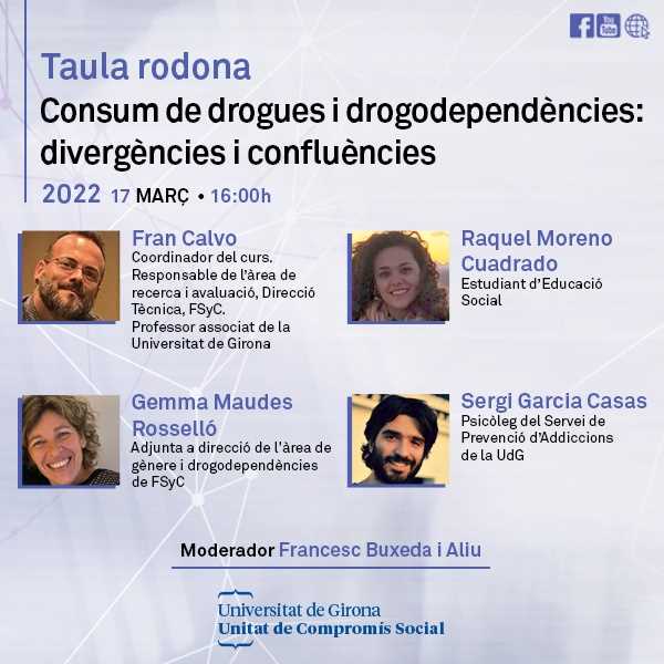 Dijous 17 de març, a les 16 h, tindrà lloc la taula rodona del curs Consum de drogues i drogodependències: divergències i confluències, en línia i oberta a tothom, a https://www.youtube.com/watch?v=U_mQjXiUZ0Y L'abús de drogues de tota mena, legals i il·legals, i l'addicció a aquestes és un dels problemes de salut i qualitat de vida evitables més importants de les societats desenvolupades. Es debatrà sobre aquestes addiccions i es parlarà del gran malestar que generen a les persones que les pateixen i al seu entorn, de la càrrega moral i de l’estigma que pesa sobre les persones que presenten conductes addictives i que sovint provoca que es negui el problema, s’oculti, i això impossibiliti buscar-hi solucions a temps. Amb la participació de: Fran Calvo García - Responsable de l’àrea de recerca i avaluació, Direcció Tècnica, FSyC. Professor associat de la UdG Sergi Garcia Casas - Psicòleg del Servei de Prevenció d'Addiccions de la UdG Gemma Maudes - Adjunta a direcció de l’àrea de gènere i drogodependències de FSyC Raquel Moreno Cuadrado - Estudiant d'Educació Social Moderador: Francesc Buxeda i Aliu