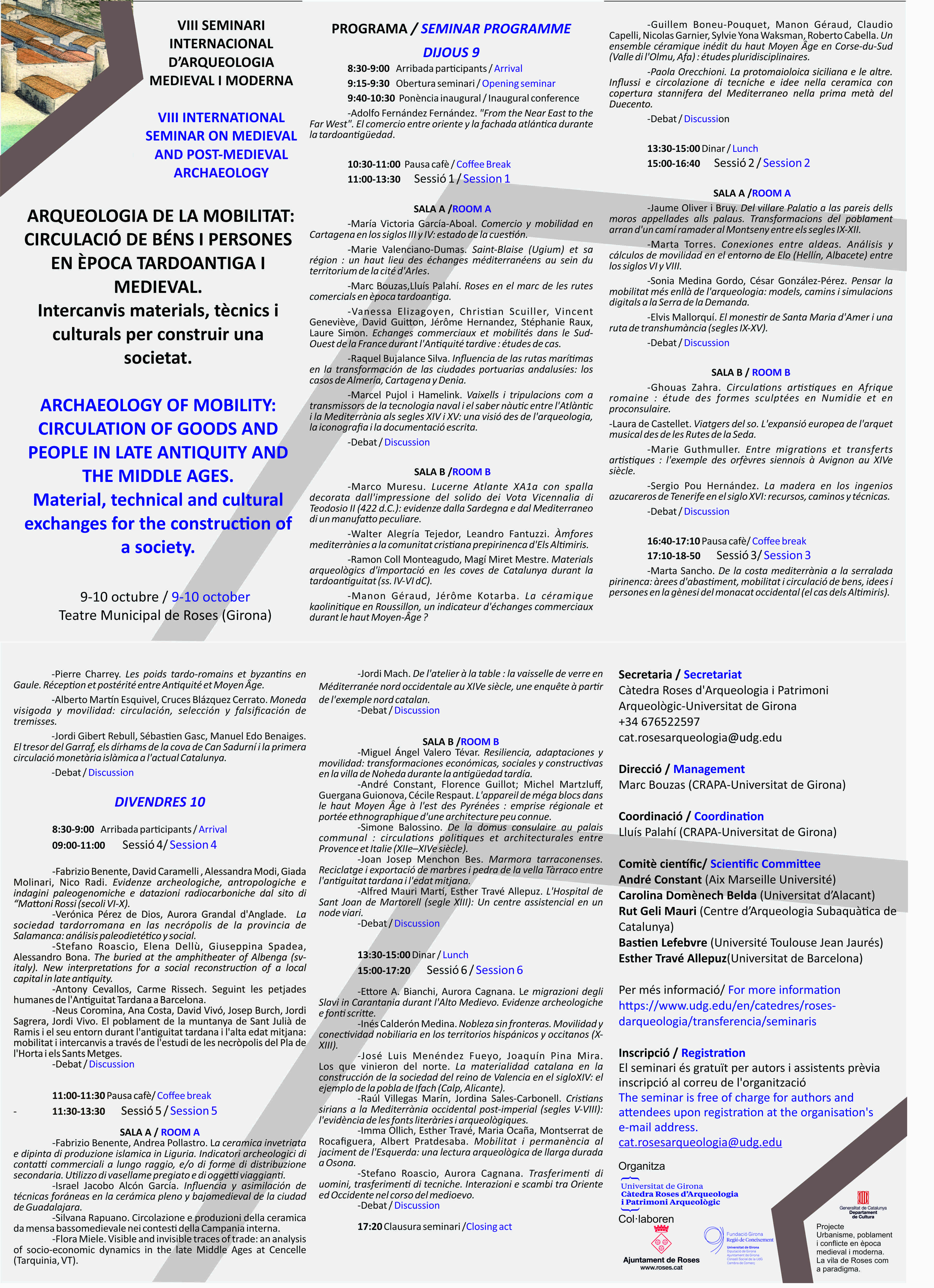 Attendance at the seminar is free of charge with registration. In order to organise the event (especially catering for meals), please specify whether you will be attending both days or just one (specifying which). To register, please send an email to cat.rosesarqueologia@udg.edu, indicating your full name and the day(s) you will be attending.
