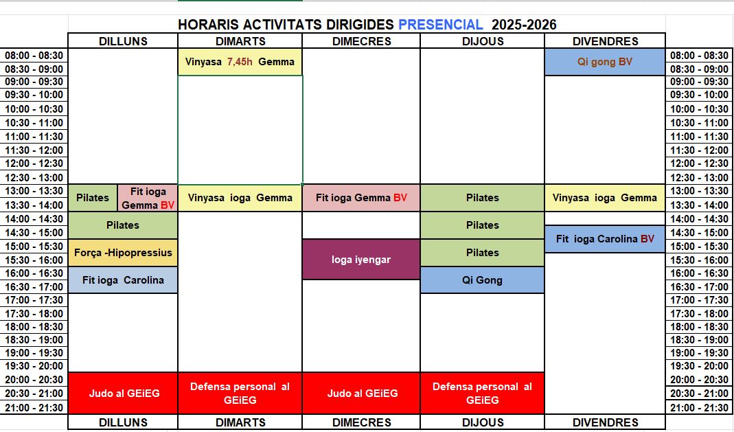 + Fit ioga Gemma BV (dilluns i/o dimecres 13 h) Es realitzarà a partir d'una dinàmica per a la millora de la teva postura que t'ajudarà a alleugerir els dolors d'esquena. A més, es millorarà la teva força, la flexibilitat i el benestar general. Et vols sentir en un cos més saludable i una ment més en calma? T'esperem a practicar aquesta experiència rejovenidora i transformadora! Professora: Gemma Xicota.