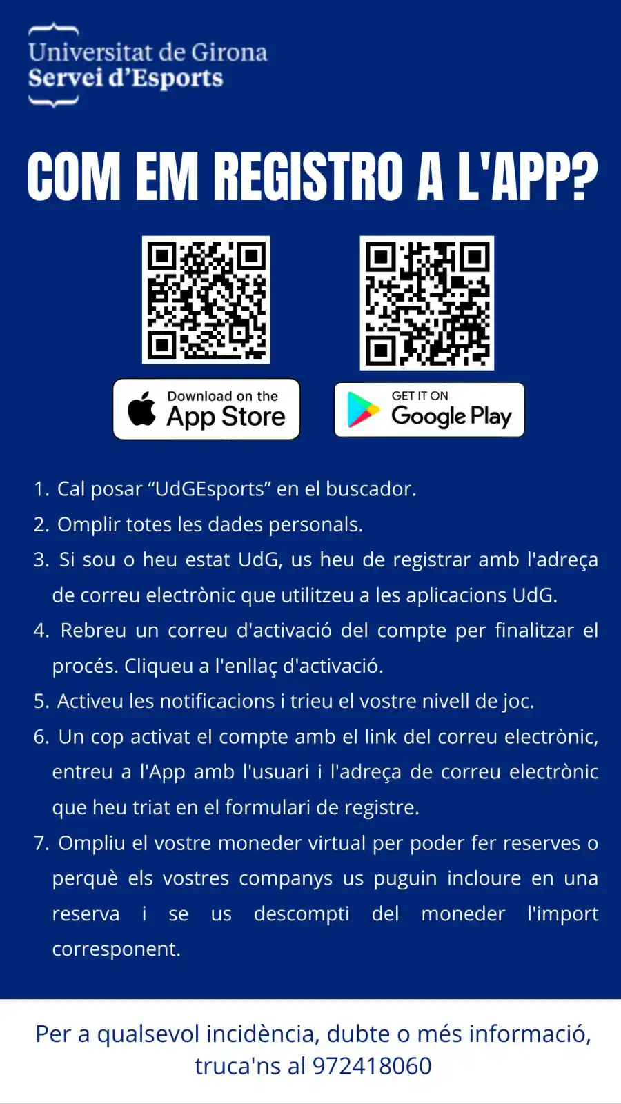 Todos los usuarios que quieran hacer una reserva tienen que bajarse la APP, registrarse y activar la cuenta haciendo clic en el enlace que se recibirá por correo electrónico.Todos los que sois UdG (también los exestudiantes), os tenéis que registrar con la dirección de correo electrónico que utilizáis en la universidad.